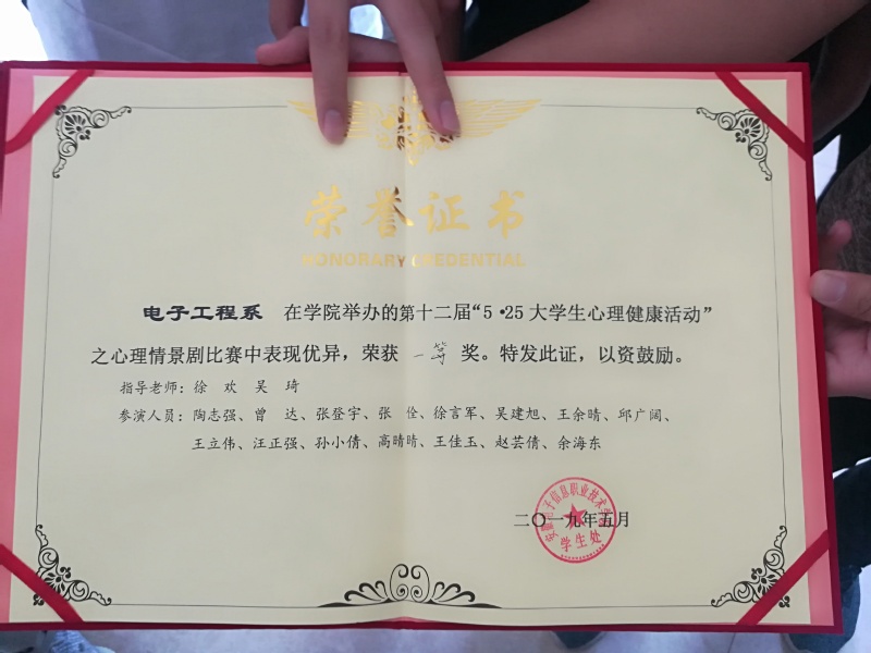 本网讯 为进一步加强我院大学生心理健康教育工作,宣传普及心理健康知识,培养学生健全的心理素质,构建和谐校园。5月29日下午,我院第十二届大学生心理健康心理情景剧在学术报告厅隆重举行,我系代表队伍在此次比赛中荣获一等奖。