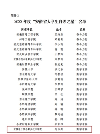本网讯 近日,2022年度“安徽省大学生自强之星”评选结果揭晓,我院学子马永其获评2022年度“安徽省大学生自强之星”荣誉称号,同时被推荐为“中国大学生自强之星”奖学金候选人。