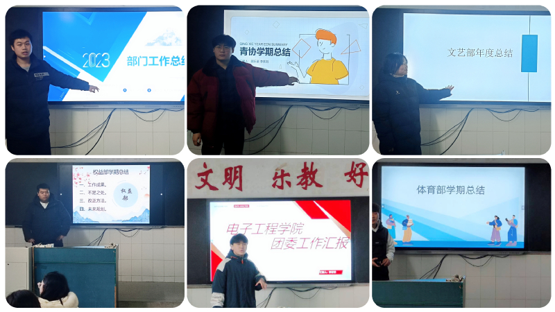 会上,电子工程学院分团委、青年志愿者协会及学生会各部门负责人依次进行工作汇报,他们回顾了一年来各自的工作成果,总结了工作经验,分析了工作中存在的不足,并针对性地提出了后续的改进措施。各学生组织负责人对2024年的工作进行了展望,表达了对做好2024年各项学生服务工作的信心,表示会以更加谦逊和稳重的态度做好学生服务工作,认真履行职责,为部门的学生工作开展做出更多贡献。