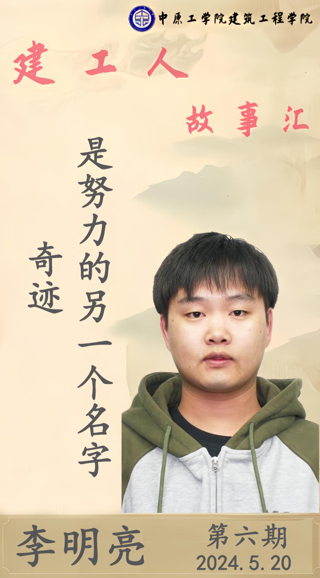 李明亮,男,汉族,中共党员,2017年9月至2021年6月在中原工学院取得学士学位,期间担任英语沙龙协会社长、班级学习委员;2021年9月至今在中原工学院建筑工程学院攻读土木水利专业硕士学位,目前已成功考取河南理工大学的博士研究生。