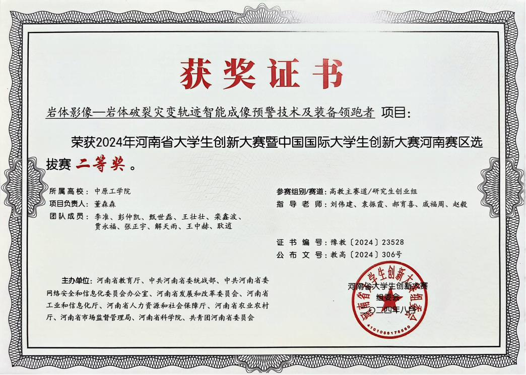 入学后,董森森认真学习专业知识,打下了扎实的理论基础,在导师刘伟建的带领下参与多项课题的研究工作,深入十余个工程现场,掌握了大量一手资料,对岩体灾害有着直观的了解,对实践验证理论,理论指导实践有了自己独到的理解,在校期间申请发明专利5项(已授权2项),申请并授权实用新型专利1项,申请并授权软著证书4项,同时在项目研究工作中通过了9项国家级产品证书。在校期间获得“校学业奖学金”、“河南省学业奖学金”、“五好学生”、“校级优秀毕业论文”等荣誉。