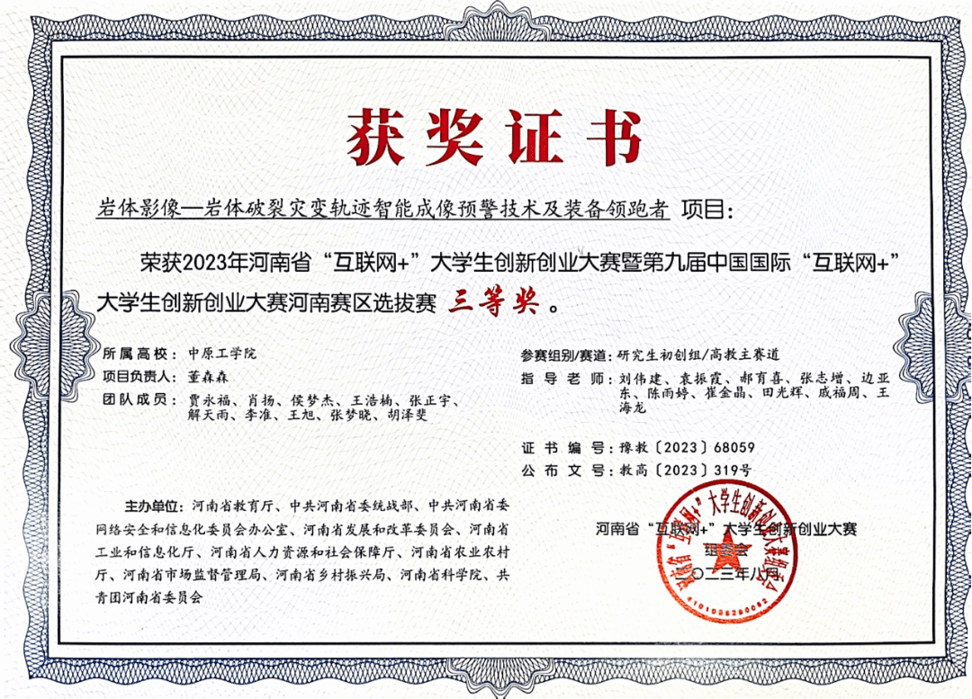 毕业后,董森森对研究的岩体灾害内容念念不忘,心系岩体灾害预警瓶颈难题,他想要在研究的领域做出成绩,但他深知个人的力量是渺小的,一个团结的队伍才能实现伟大梦想,于是他在研究生导师刘伟建的指导下,在学院多位老师的支持下,逐步建立起以研究生为主,同时为本科同学提供学习机会的研发团队,在中原工学院大学科技园创办郑州安岩智能科技有限公司(2023年更名为安岩智能科技(常州)有限公司河南分公司),并且享受到了学校给予的租金优惠政策。
