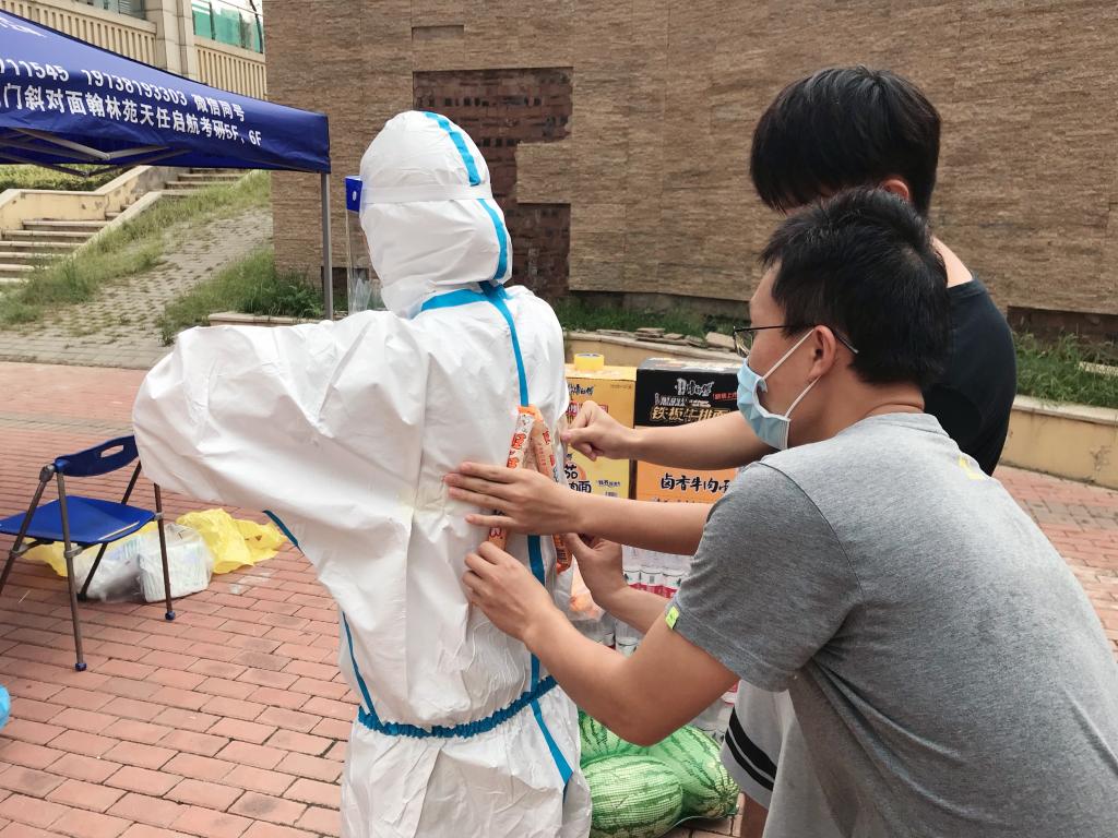 南校区及家属区所处位置于8月5日通告划为封控区,核酸检测的工作目前已经进行到第四轮了,医护人员为了给南区居住的老师和学生们进行咽拭子样本采集,套在密不透风的防护服里、戴着隔离面罩,一天下来,如同蒸桑拿一般,张书记了解到此种情况后,想到使用冰冻的碎碎冰帮助医护人员进行降温,立马着手安排会员进行购买。在每天规定2小时外出时间的情况下,会员们克服重重困难购置了桶装方便面、水、水果、碎碎冰等物品,将物品送到南区校外家属院下沉广场处,慰问开展工作的一线人员。会员们在现场帮一线人员进行准备工作,并将冰冻的碎碎冰绑在了医护人员的防护服外面。