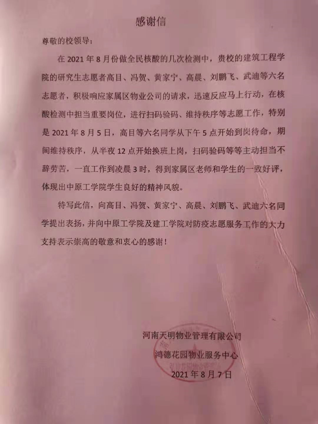 我院高目、冯贺、黄家宁、高晨、刘鹏飞、武迪六名留校研究生积极响应鸿德花园物业服务中心的号召,向所在社区党总支主动请缨,协助基层抗疫,在做好个人防护的基础上,积极投身到核酸检测志愿服务当中。河南天明物业管理有限公司特写感谢信向上述六位同学提出表扬,信中写到这六名同学勇于担当,不辞劳苦,得到了家属区老师和学生的一致好评,充分展现了中原工学院建筑工程学院研究生的良好精神风貌,并向中原工学院及建筑工程学院对防疫志愿者服务工作的大力支持表示崇高的敬意和衷心的感谢。我院19级樊帅龙,20级张建树、李子山、王浩聿、杨秉昊、方帅超等同学分别在所在地参与疫情防控志愿者工作,为抗击疫情贡献自己的青春力量。