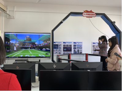 随后,一行人到我院工会创新阵地——VR工会活动室参观指导,学院党委书记张志增汇报了我院VR工会创新阵地的建设情况。王晓饶有兴致地戴上VR眼镜,穿梭时空,“沉浸式”体验了建党百年的风雨征程;而后又“置身”不同体育项目的竞技现场,“身临其境”与竞技对手进行了一场酣畅淋漓的比赛。