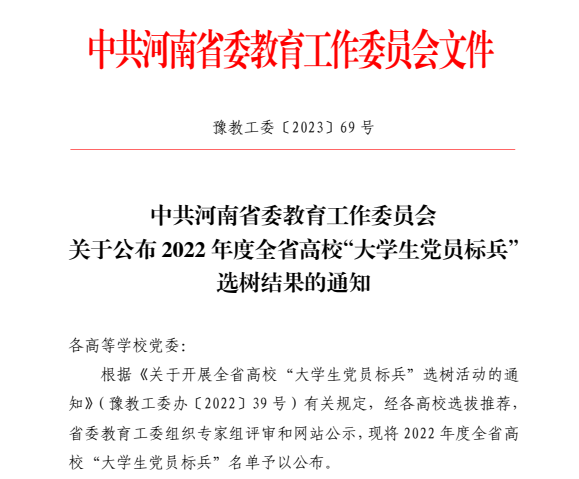 近日,由中共河南省委教育工委开展的全省高校“大学生党员标兵”评审结果揭晓。经学校推荐、省委教育工委评审,我院20级研究生燕依梦荣获“大学生党员标兵”称号。
