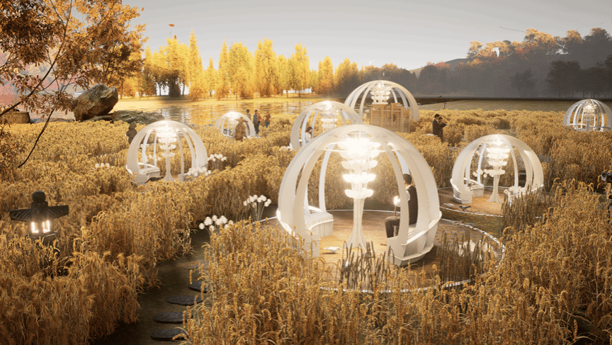 结合竞赛以“筒·藏”为主题的校园休憩空间设计的要求,在孔莹博、夏晓敏两位老师的指导下,学生们以小麦的生长周期过程为灵感思路,从小麦种子到发芽、麦苗、抽穗、直至成熟收获、筑仓来进行形体塑造。外形以粮仓和麦粒为原型,将粮仓的圆形平面与麦粒的弧形外表相结合,形成一个聚合的内藏空间,既代表粮仓的存储功能,也表达了麦粒内幼小胚芽所蕴含的顽强生命力,同时寓意着对粮食的守护,和对生命力的赞扬。