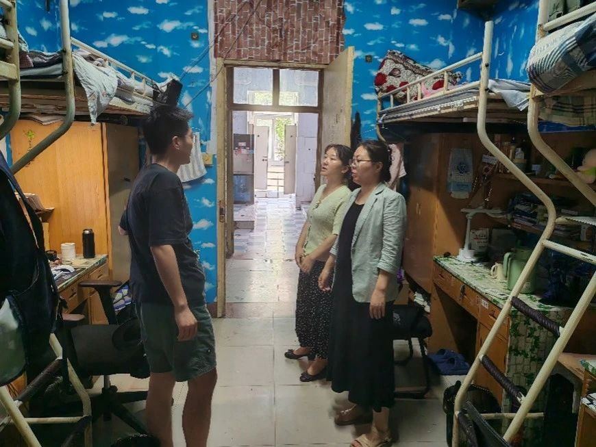 在学生宿舍,老师们与留校备考学生亲切交谈,对学生们不惧酷暑、全心投入的拼搏精神给予了充分肯定,嘱咐学生们要注意劳逸结合,保持健康的作息和良好的生活习惯,要注意人身、财产、宿舍用电等安全问题。