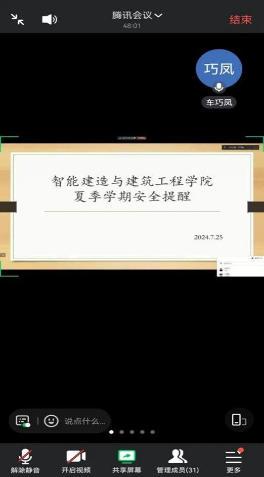 线上安全教育会议上,车巧凤就居家安全、旅行安全、网络安全、防溺水、防诈骗、防范灾害性天气等方面进行再提醒、再教育,希望学生干部居家也要紧绷安全之弦,关注班级学生动态,发挥学院与学生沟通桥梁的作用,做好学生关怀。