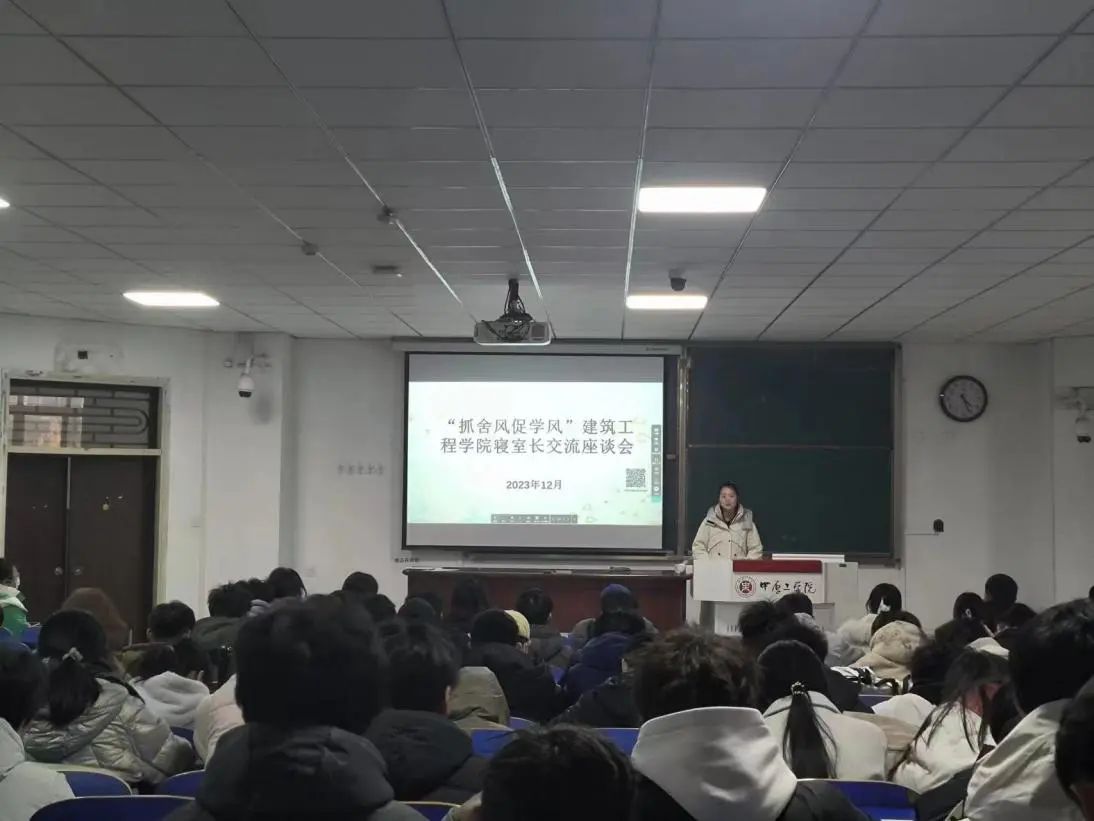 为加强舍风建设,促进寝室成员文明习惯和文明举止的养成,发挥寝室长的作用,进一步加强寝室学风建设。2023年12月19日,建筑工程学院召开“抓舍风 促学风”主题寝室长交流座谈会,学生工作办公室卢亚琼、沈红豆、赵兵和全体寝室长参加会议。