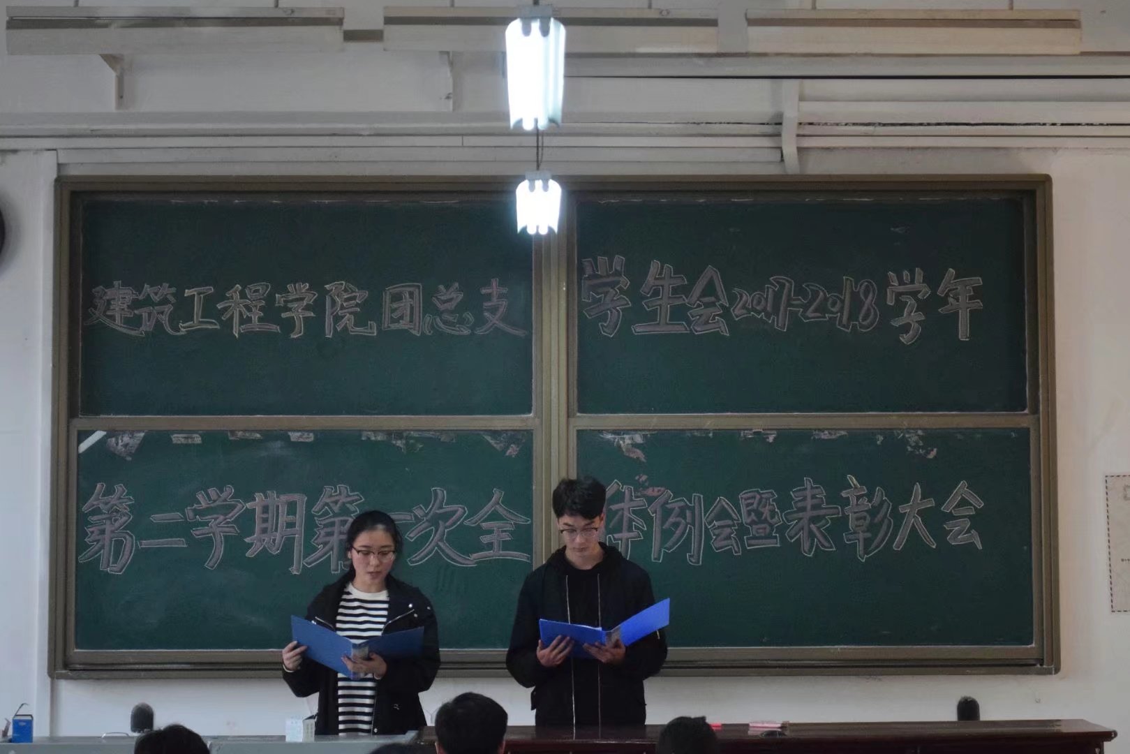 与会嘉宾有:建筑工程学院团总支副书记赵兵,建筑工程学院团总支学生会全体成员。大会进行有颁奖与代表发言环节,目的是为了对上学期的工作进行总结,对下学期的工作进行要求。