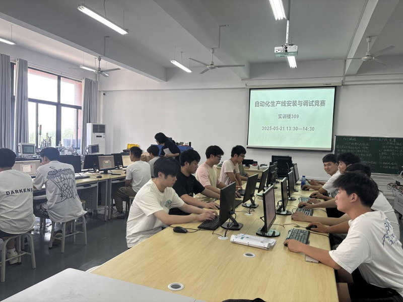 本网讯 为进一步提升学生的自动化生产线安装与调试技能水平,激发学生对专业技能的学习兴趣,5月21日,由教科研处主办、机电工程学院承办的比赛在实训楼309和302顺利落下帷幕。本次竞赛吸引了多位对自动线编程调试有浓厚兴趣和扎实基础的学生参与,为他们提供了一个展示专业技能和能力的机会。