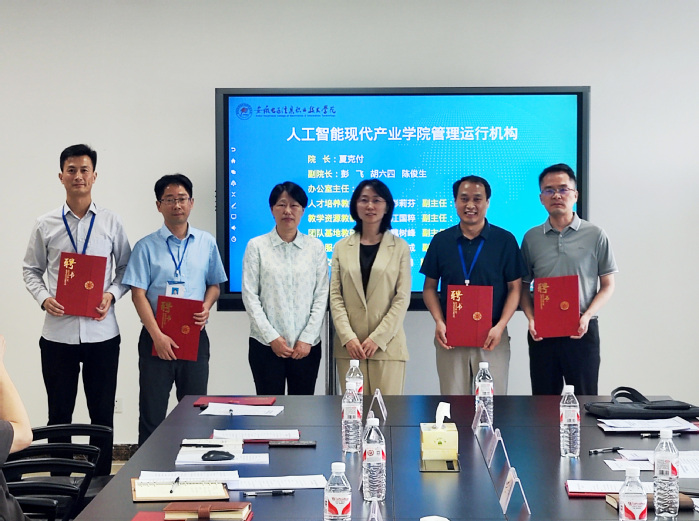 会上,闻学宣读了《关于成立人工智能现代产业学院管理运行机构的通知》,李素文院长和马季总经理向产业学院院长、副院长颁发了聘书。