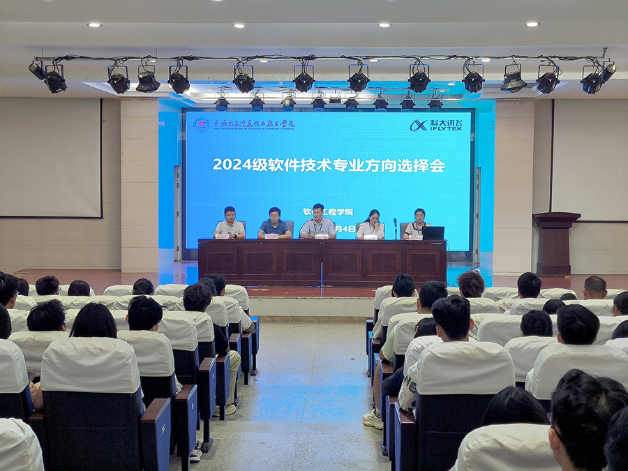 本网讯 9 月 4 日上午,软件工程学院在信息楼学术报告厅召开了 2024 级软件技术专业方向选择会。软件技术专业带头人彭莉芬、王林,科大讯飞股份有限公司项目经理王金雨,专任教师李曼玉和2024 级软件技术专业全体新生参加了方向选择会。会议由软件技术教研室主任胡六四主持。