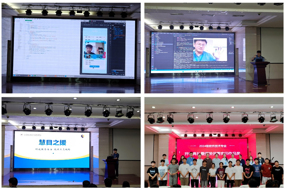 软件技术专业2023级部分学生向新生们展示了他们的企业项目实训作品,包括音乐网站、车包保、智慧导游、多功能程序终端、AI聊天助手等。新生全程参与互动,并进行最终的作品投票。精彩的作品让他们大开眼界,更直观地了解软件技术专业的教学内容。活动现场还根据同学们的投票结果确定了2023级企业项目实训的一、二、三等奖并进行了颁奖。同时在本次专业教育活动上,软件技术专业2022级周玮同学还展示了安徽省2024年挑战杯金奖作品“慧目之援”,软件技术专业赵鹏程老师演示了AI“隔空写字”项目。