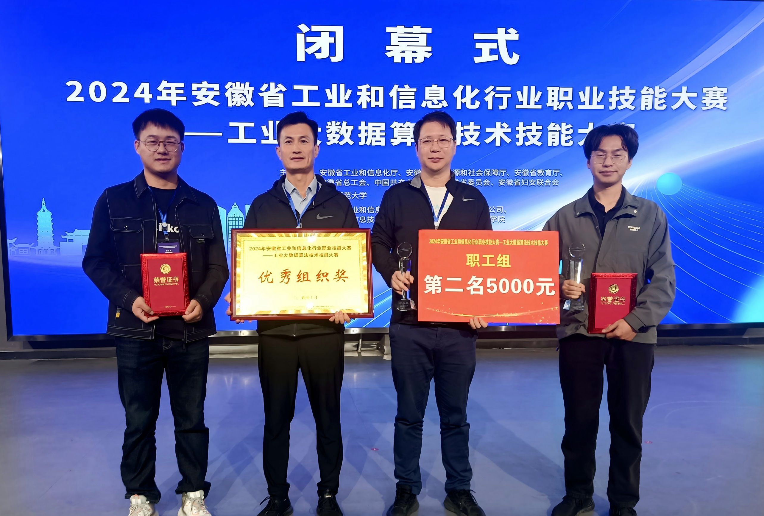本网讯 10月18日至20日,由省工信厅、人社厅、教育厅、省总工会、团省委、省妇联等六家单位共同举办的2024年全省工业和信息化行业职业技能大赛——工业大数据算法技术技能大赛在安庆师范大学成功举办。学院教师胡六四和孙涛组成的1队荣获职工组一等奖(第二名),邵黑龙和赵鹏程组成的2队获得三等奖,学院被授予优秀组织奖。