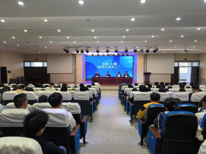 本网讯 10月23日下午,软件工程学院在信息中心学术报告厅举办了“电院-后翼内容工厂”专题宣讲会。安徽后翼供应链科技有限公司(以下简称:后翼科技)总经理宛翔宇,视觉设计师葛蕾,数字艺术教研室主任单盛以及2023级软件技术、数字媒体专业的200余名同学参加活动,活动由人工智能现代产业学院副院长胡六四主持。