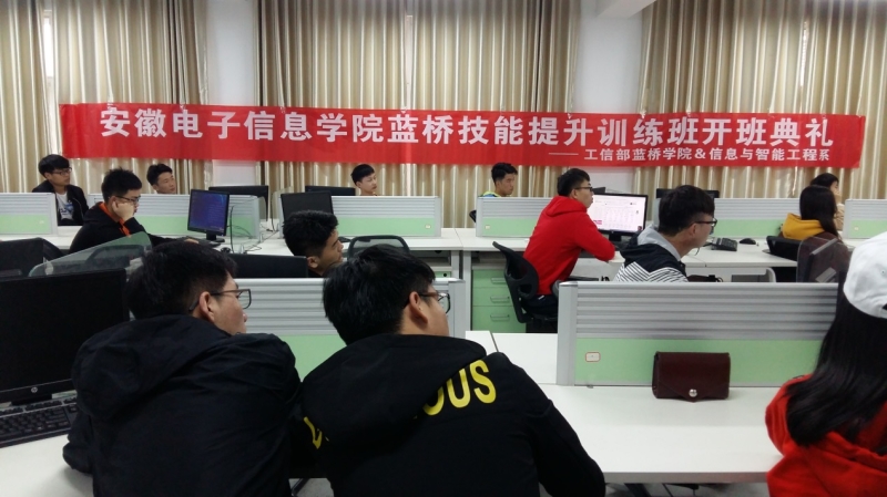 本网讯 4月23日,安徽电子信息职业技术学院蓝桥技能提升训练班开班典礼在信息中心北401项目实训室举行,本次技能提升训练班由工业和信息化部人才交流中心蓝桥学院与信息与智能工程系共同举办。蓝桥学院项目经理任浩、工程师高会仁、信息与智能工程系副主任尹汪宏、WEB应用教研室主任陈键、智能控制教研室主任王锦出席了开班典礼,信息与智能工程计算机应用技术等专业40余名学生参加了开班典礼。