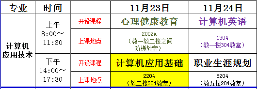 安徽电子信息职业技术学院2019-2020学年第一学期高职扩招学生第二次线下授课预约安排已经开始,请计算机应用技术专业各班级学生根据个人实际进行预约,具体安排如下: