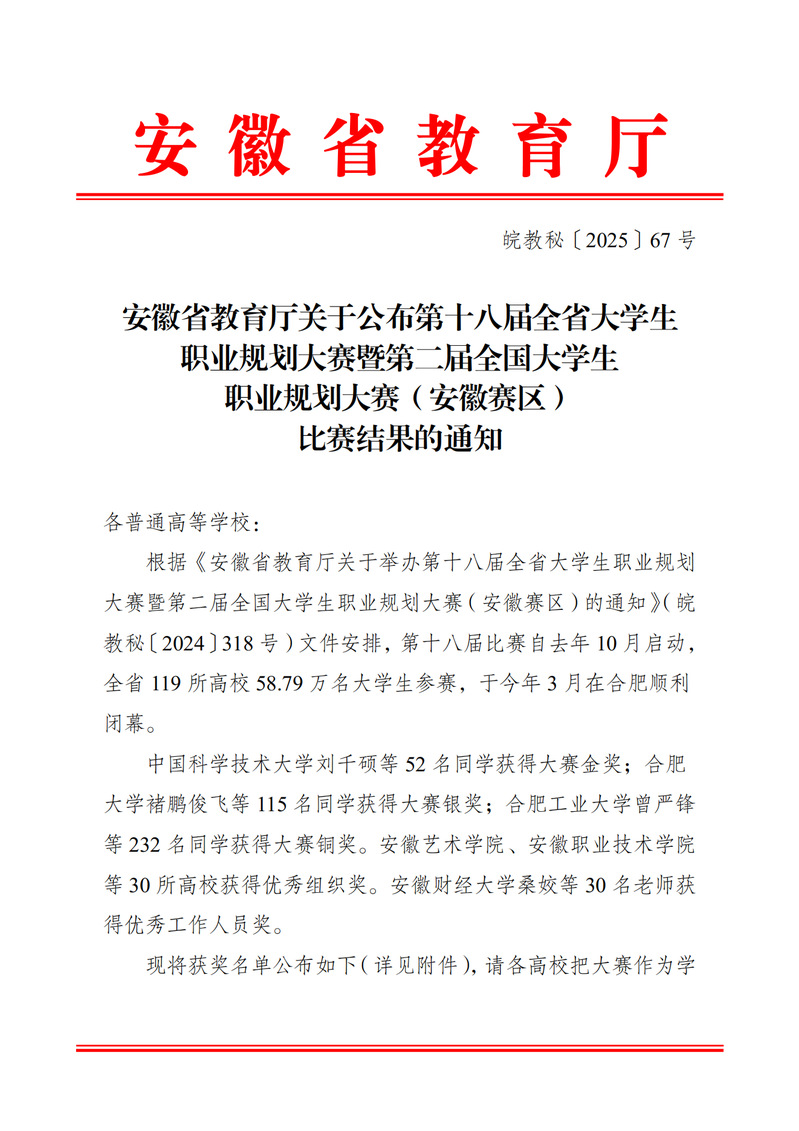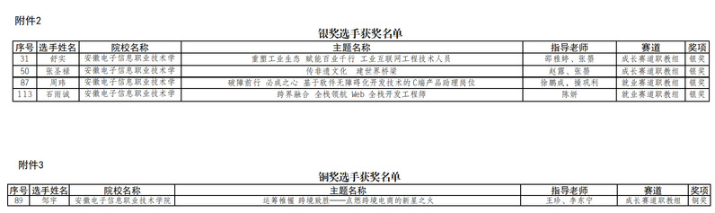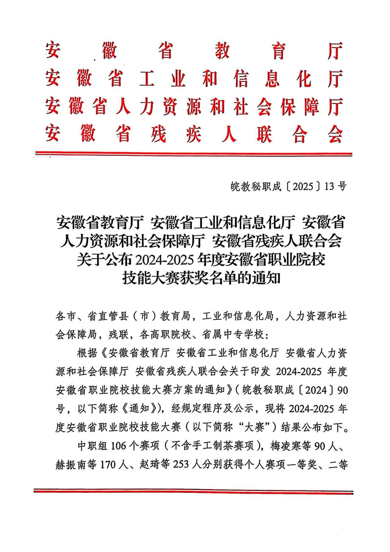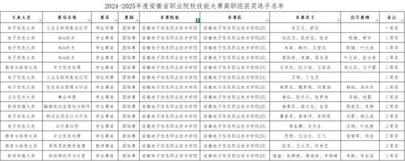 本网讯 近日,从安徽省教育厅等4部门《关于公布2024-2025年度安徽省职业院校技能大赛获奖名单的通知》(皖教秘职成〔2025〕13号)、安徽省教育厅《关于公布第十八届全省大学生职业规划大赛暨第二届全国大学生职业规划大赛(安徽赛区)比赛结果的通知》(皖教秘〔2025〕67号)等文件知悉,信息工程学院师生在以上相关赛事中表现优异,在多个赛项中取得优异成绩。